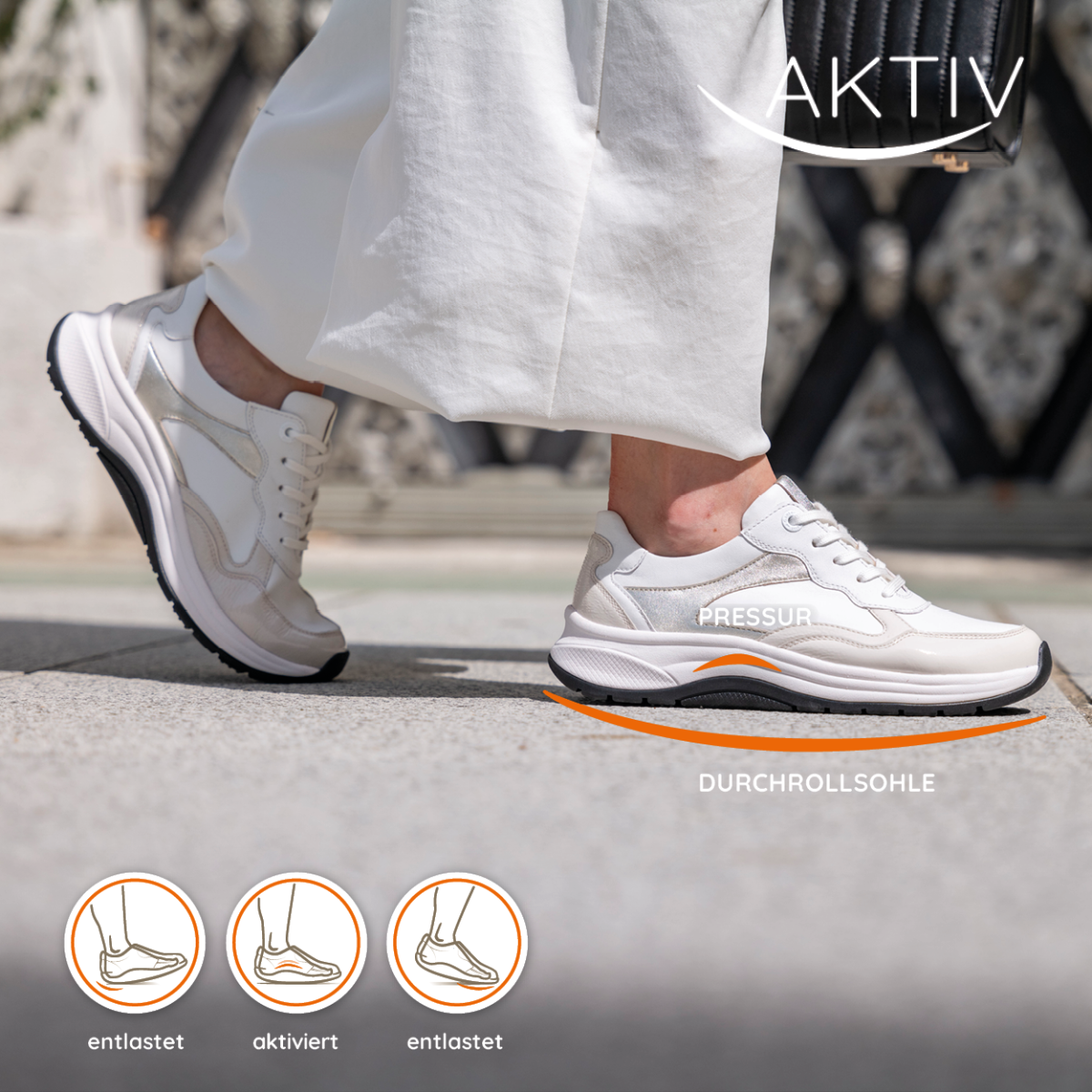 Die „4-Punkt-Durchroll-Sohle mit Pressuraktivierung“ reduziert die Aufprall- und Hebelkräfte auf Fuß, Knie, Hüfte und Wirbelsäule. - Verbessert die Haltung